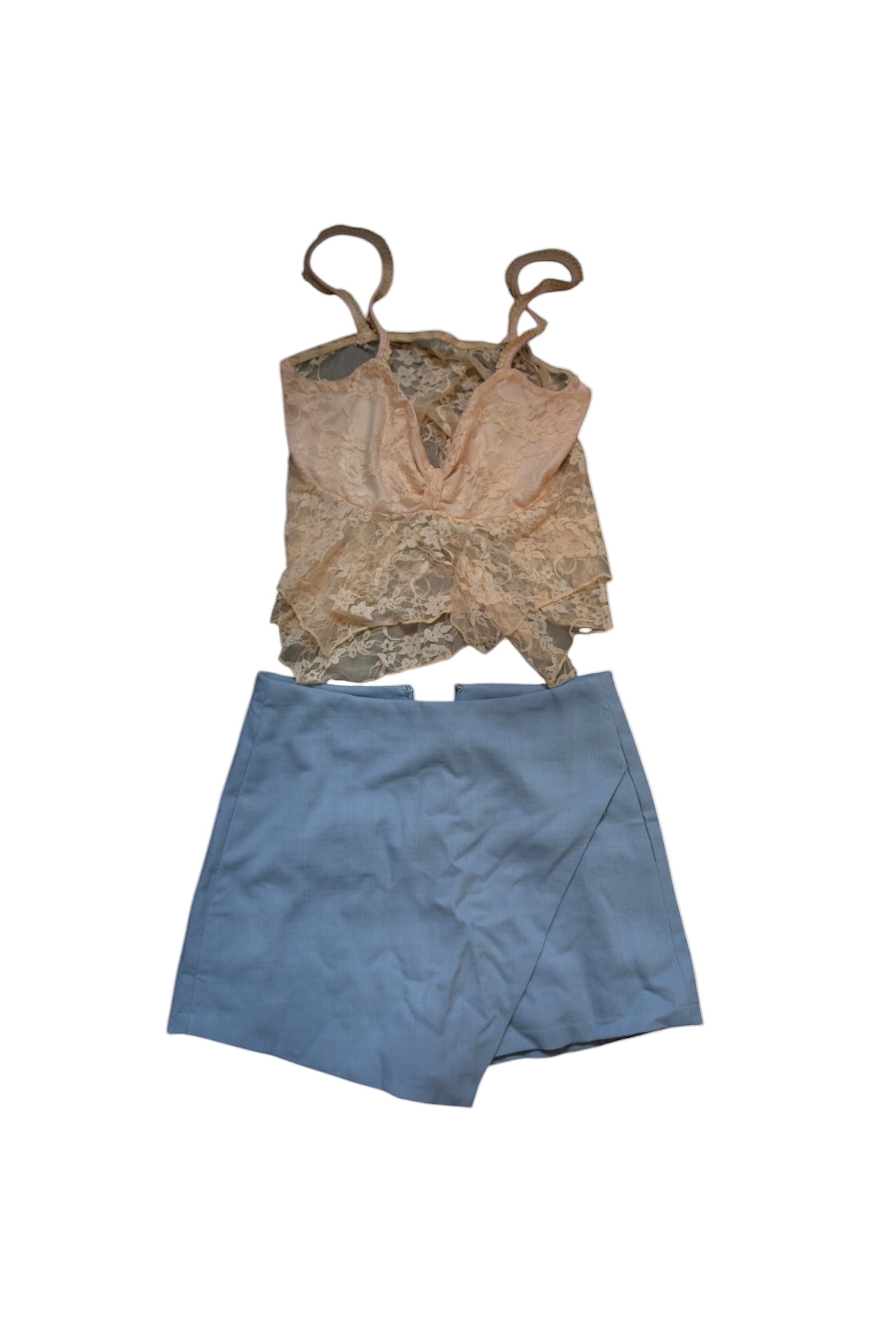 繊細なレース素材のベージュキャミソールと、ラップデザインが特徴のブルーグレー系ミニスカートのセット。