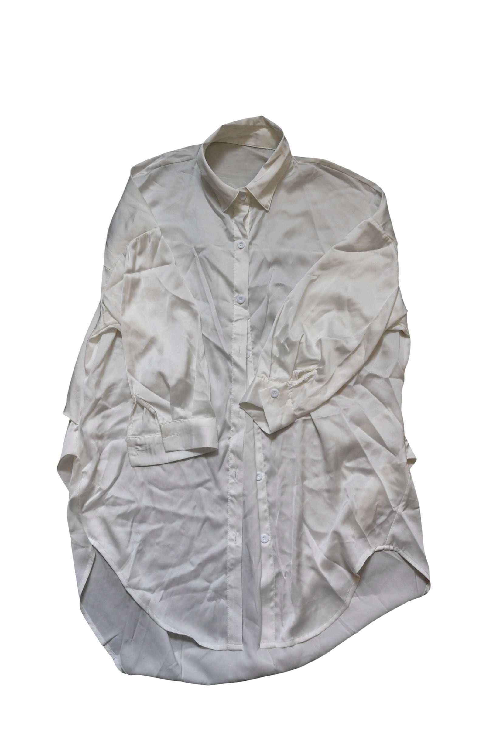 サテン調の上品な光沢があるホワイトシャツ。ルーズに着ても雰囲気が出やすく、スタイリングの幅が広い一着です。